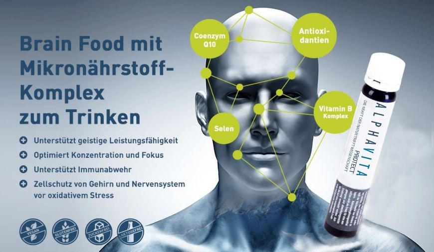 Aufgrund seiner Zusammensetzung der Inhaltsstoffe kann man ALPHAVITA PROTECT sowohl als „Brain Food“ als auch als „Immunkur“ bezeichnen, auch wenn der Begriff „food“ bei einem flüssigen Produkt zum Trinken etwas ungewöhnlich wirkt.